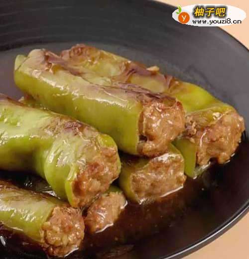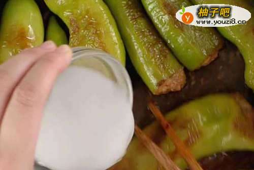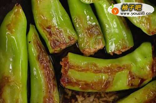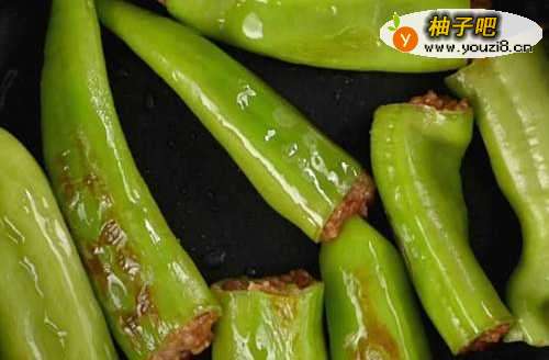 4锅中倒入油,放入酿号肉馅的尖椒,小火煎到一面金黄呈虎皮状,翻面盖上锅盖继续煎到表面呈虎皮状。这时候肉馅基本上就熟了。