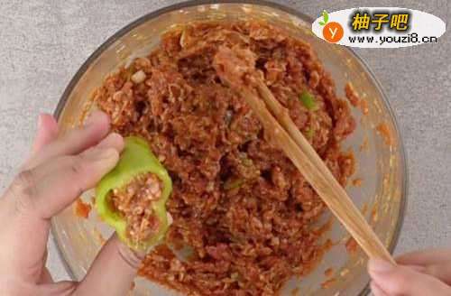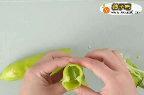 青椒洗净,切去顶部,去掉里面的籽。如果青椒比较大就从中间切开