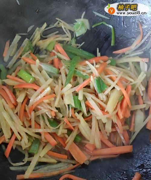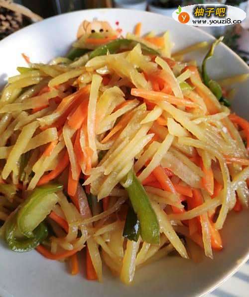 1.土豆去皮切丝,用清水洗掉表面的淀粉;2.胡萝卜切丝、青椒切丝装盘备用;3.中火朝青椒,加入葱花炒出香味;4.加入土豆丝,炒至变软;5.加入胡萝卜丝,酱油醋盐等调味品;6.炒至变色变软,即可成熟出锅。