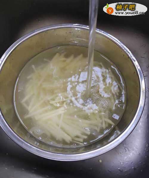 把土豆去皮切成丝,盛在盆里,用清水洗掉表面的淀粉。一定要洗干净,不然容易糊锅。