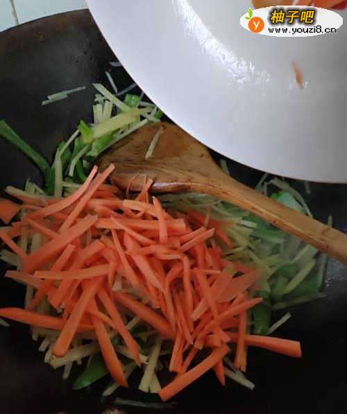 7如果火太大油太少,可能会出现糊锅现象,这时候可以加点儿清水。炒到三丝外表变色,变软即可出锅。