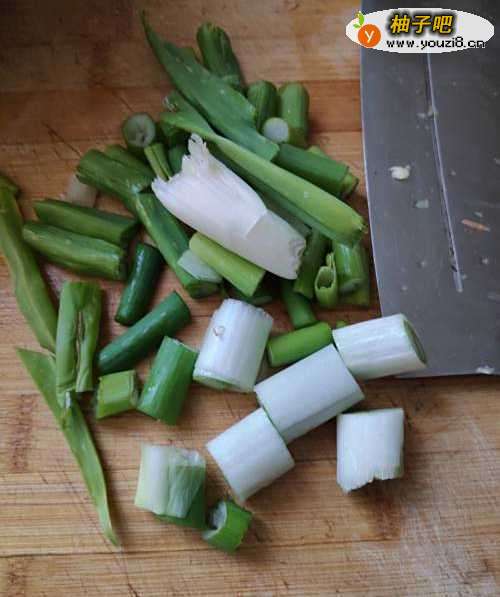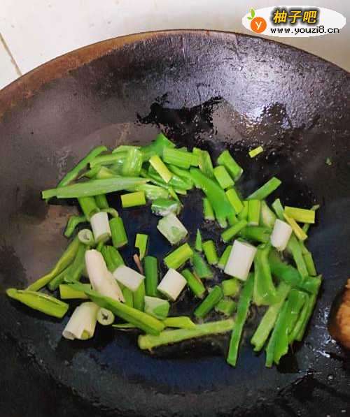 4大约30秒后,把葱花倒入锅内,炒出香味。