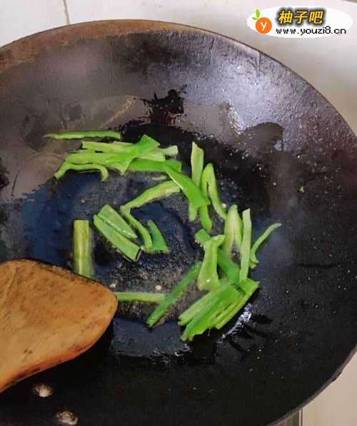 3炒锅内放入油,开中火,加入青椒丝开始炒。