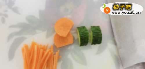 3切两节黄瓜,两片胡萝卜、和一些胡萝卜丝