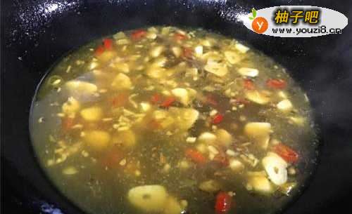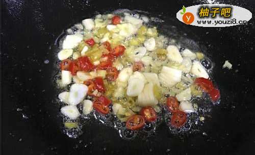 6锅底留少许油把泡椒、红椒、姜、蒜一起放进去锅里爆香。