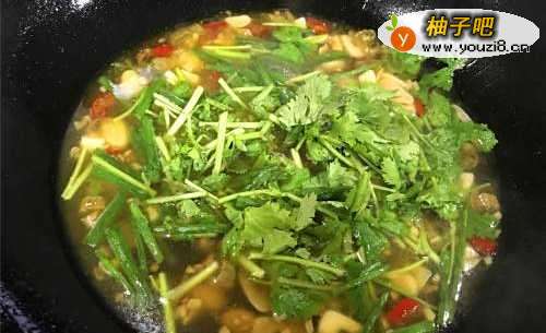 8当锅里的汤汁变浓稠的时候,放入香菜叶和葱叶,关火。
