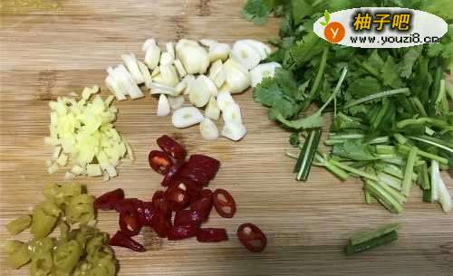 3准备好一些小葱、生姜、蒜、香菜切好备用。