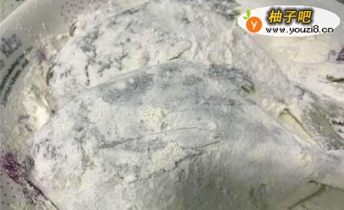 2在鱼身的两面涂上一点点盐,再拍上一层干面粉。
