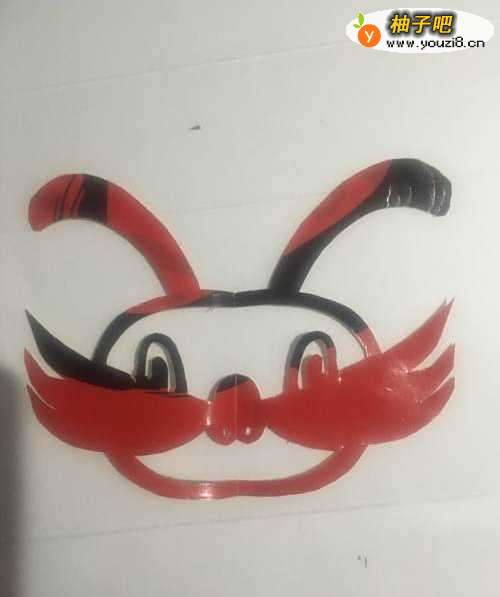 6第六步 剪完外围多余的彩纸之后 再剪里面细致的部分 和其它涂实的部分 剪完之后取开铺平 一只可爱的兔子头就剪完了
