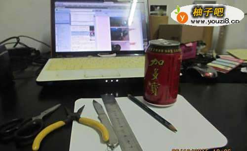 2、 易拉罐上面都有一条密封用的线,用剪刀沿着这条线剪开,得到一个弯曲的铝片(如果找不到的话就用笔沿着尺子在铝圈上画一条垂直于铝圈的线)接着拉直铝片,然后按压在桌子边缘或者是椅子扶手上面,来回拉,正面弯了就翻一面重复,(总之就是遇到弯曲或者不平整的地方放在桌子边缘处按压),直到铝片变得相对平整。注意:(1可以用圆规上的针沿着线等间距刺出小孔,方便后期用小刀切黑线(2铝片遇到弯曲或者不平整的地方放在桌子边缘处按压 可以使铝片平整
