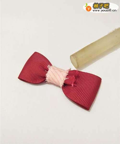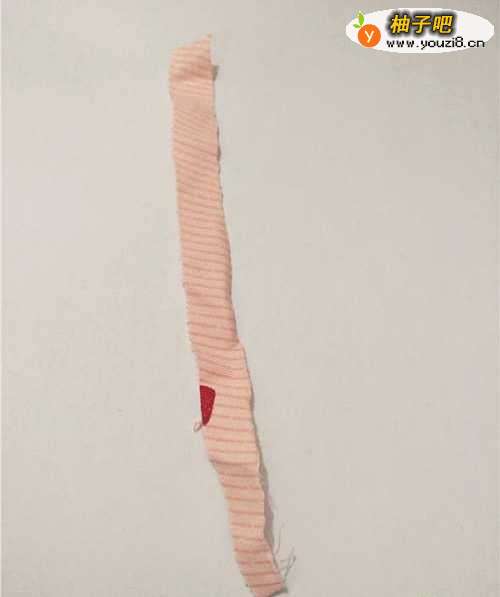6用塑料胶棒将布条的末端粘在丝带背面。