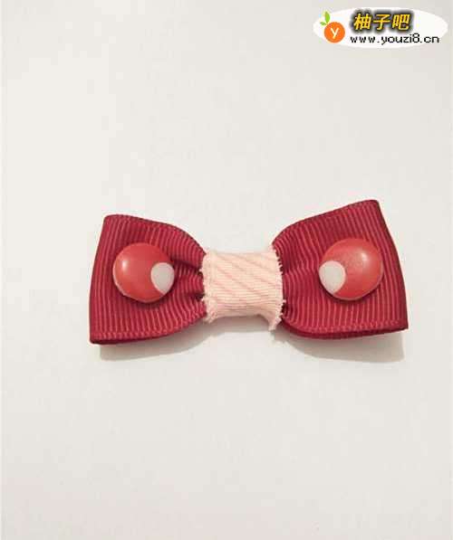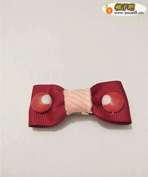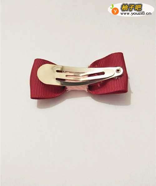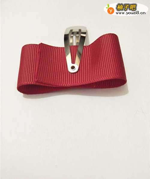 8在水滴卡子两端抹上胶棒,粘在丝带背面两端,一个简单易做的小发卡就做好了,送给小女孩,小女孩会特别开心。
