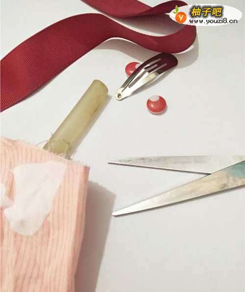 先把做发卡要用到的丝带、布头、胶棒、剪刀、水滴卡子和扣子准备好。