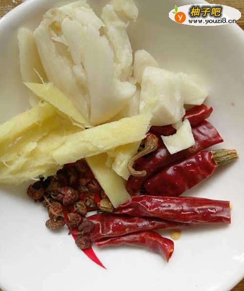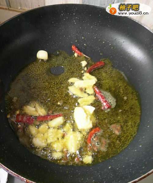 6放入干辣椒 花椒 生姜 大蒜爆出香味