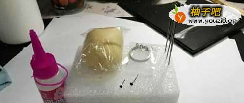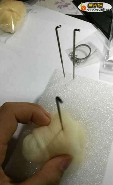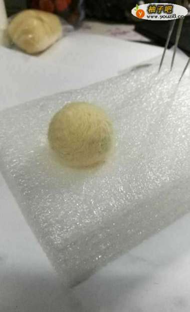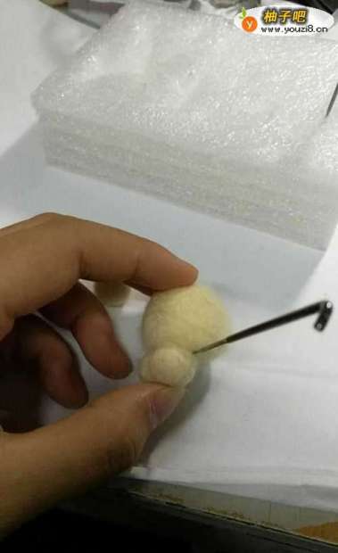 7在大圆球上戳两个小眼,用胶水粘上眼睛,再戳上胡子