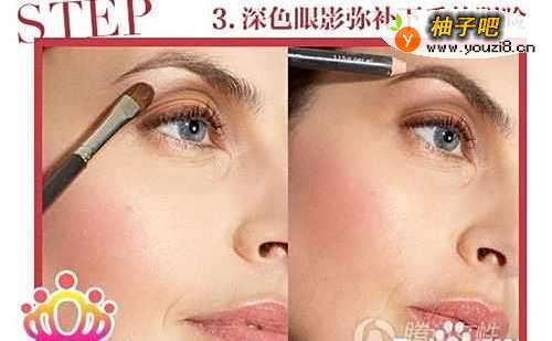 浅色眼影会放大你原本就开始下垂的眼睑,而深色恰恰能起到相反的作用。因此我们使用深色的眼影,弥补下垂的眼睑。