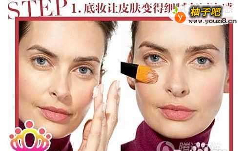岁月让皮肤开始出现皱纹,选择适当颜色的底妆可以让你的肌肤看起来平滑,并且不会让脸色看的苍白。用毛刷集中在关键部位涂上粉底,比如鼻子、前额、下巴。这样会突出你脸部的轮廓。但千万不要涂厚,不然只会更突出你的皱纹