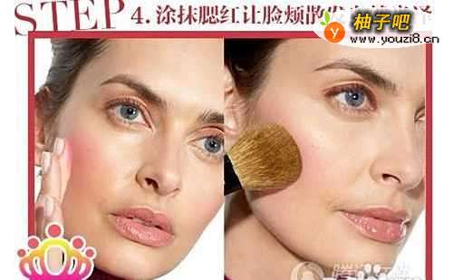 脸颊的颜色是化妆中最重要的部分,先将奶油色的腮红在你脸部自然地揉抹开,再用两根手指涂抹鲜亮色的腮红在你需要提亮的地方。