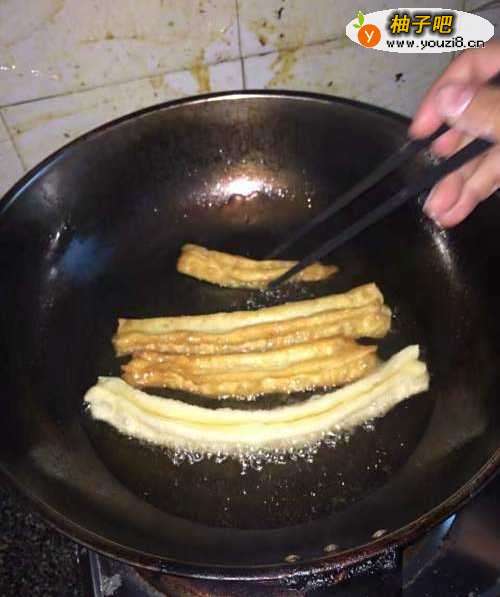5油锅烧到七成热,下油条坯子炸制,边炸边给它翻身。