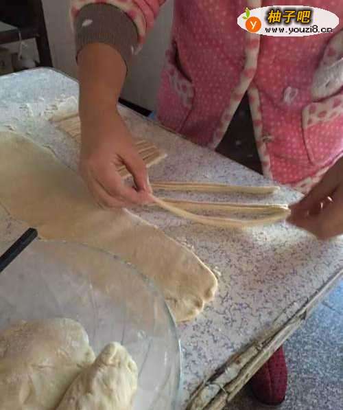 4案板上抹油,手上也要抹油,将面团在案板上按压成长方形,刀上也抹油,将大面片切成小条,两根面条叠在一起,压扁,用筷子在中间压道沟出来。