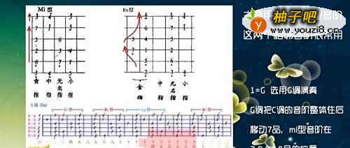 2这里主要用Mi型音阶、Re型音阶,相邻的两个最常用的音阶,音阶指型适合所有调的歌曲,这里演奏的是G调,看下图音阶指型和在G调的吉他指板位置