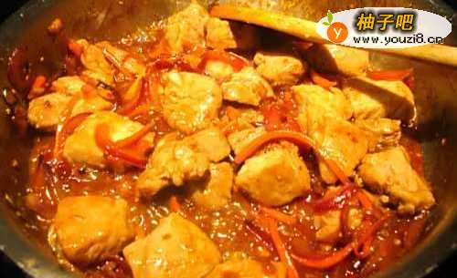 4洋葱和红萝卜炒软之后,再放猪肉块,与蔬菜拌炒均匀,倒入调好的苏梅酱汁,盖上锅盖把火转小,闷煮十分钟
