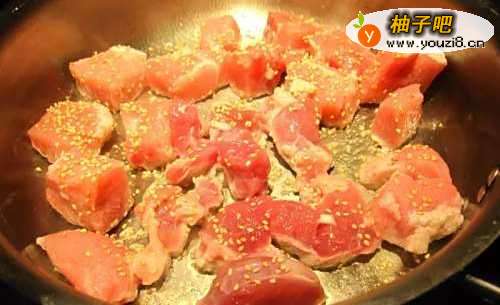2切块的猪排下锅,用中大火将表面煎过,可以洒点芝麻增添香气,表面上色就好,捞起来备用