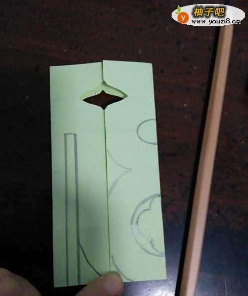 5然后我们把折纸打开,并在折纸上画上准备要用剪刀剪得图样。如图。画直线的时候,我们可以用尺子来画。
