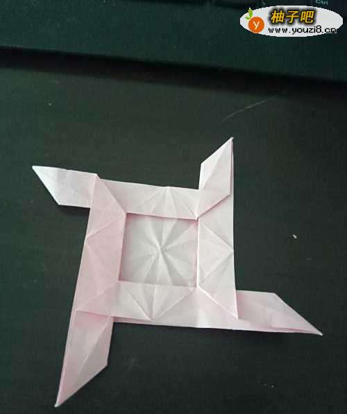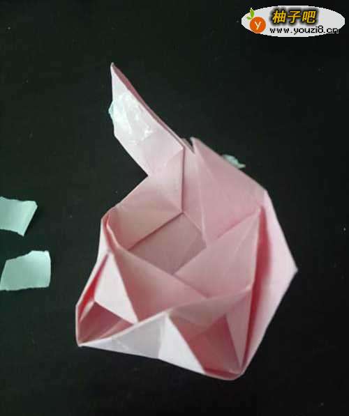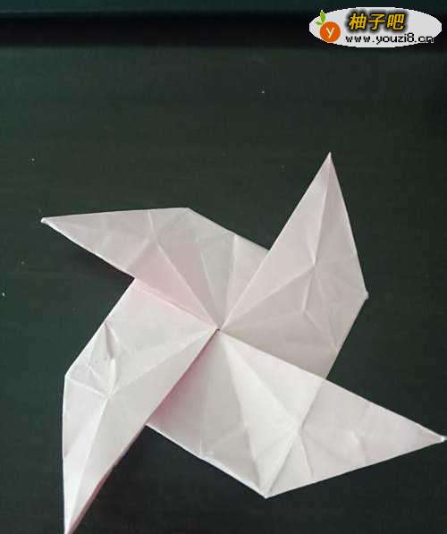 3把风车向内的一边往后对折,压实,把旁边推起来,对折,压实到底,翻起第三个面的边,同时把右边尖角部分压实