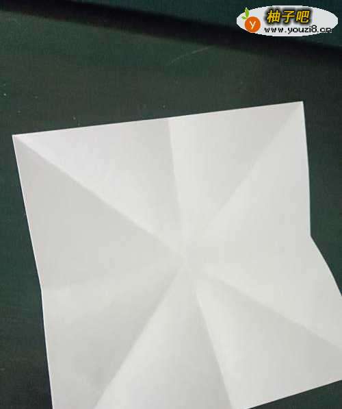 将一张正方形的卡纸,三角形对折,正方形对折,折出折痕后打开,然后四角向中间对折,打开后两边向中对折,根据折痕打开