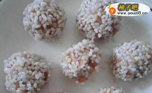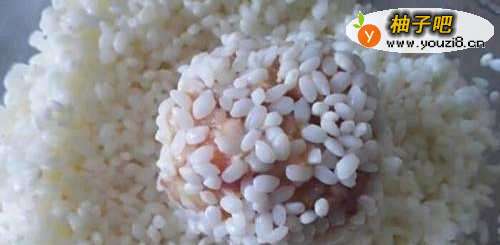 6接着我们可以把搅拌好的肉馅做成一个团子,然后裹上备好的糯米。
