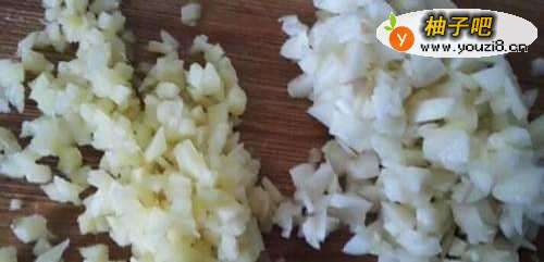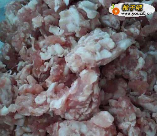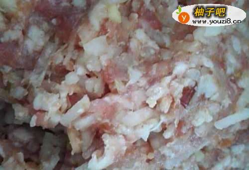 5把我们切好的姜和蒜倒入肉馅中,并加入适量的十三香,老抽,盐,糖。然后朝一个方向搅拌均匀。