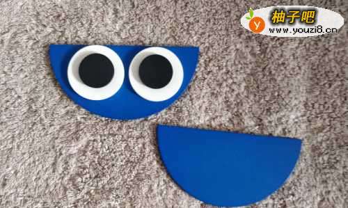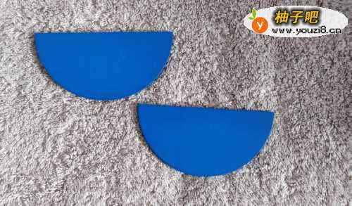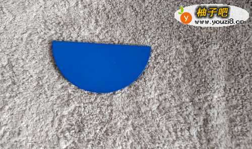 6将两个青色半圆左右排列,弧线在外侧,放在上侧蓝色半圆的上面,如图。