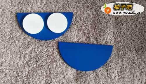 4在上侧半圆的上面,放上两个水平间隔的白色圆形,如图。