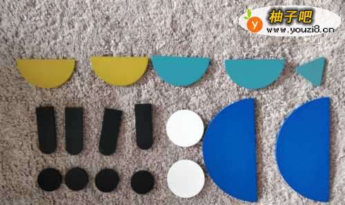 准备好蒙氏几何积木。此处用到的是2个大半圆、2个白色圆形、4个黑色小圆形、4个小半圆、1个三角形、4个手指形,如图所示。