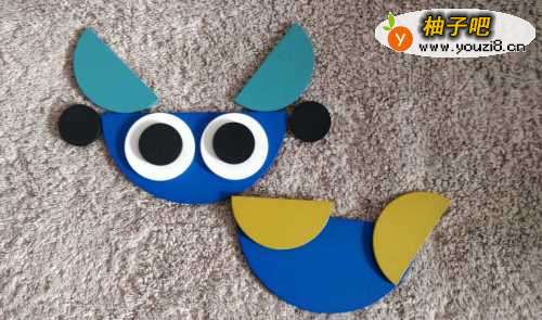 8将一个黄色小半圆,弧线在下,放在下侧大半圆的左上侧挨着;将另外一个黄色小半圆,弧线在左上,放在下侧大半圆的右上侧挨着。如图。