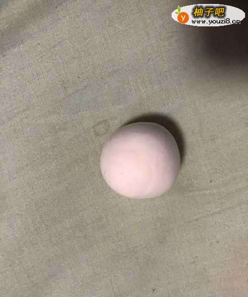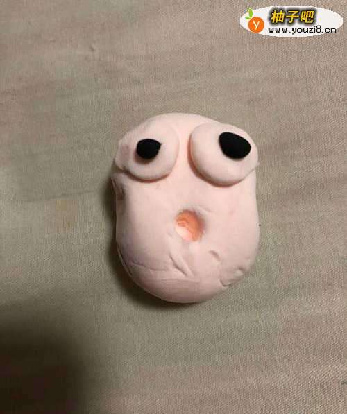 拿出肉色的彩泥揉成一个圆形,在拿出肉色揉成小长条在上面查两个窟窿,粘到圆形上面。