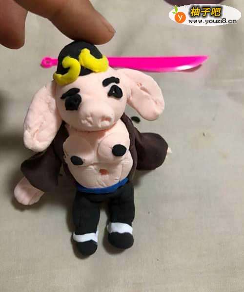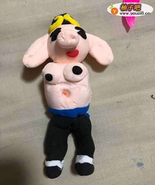 4在拿出肉色做成八戒的身体,在拿出黑色的彩泥揉成长条用小刀从中间分开,在拿出黑色的彩泥揉成两个小长条粘到下面。