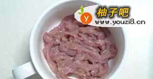将猪肉切丝,要顺着肉的纹理切,不要横着切,否则不好吃。切好的肉丝用前面标明的腌肉的那部分调料将肉丝抓匀,腌上10-15分钟