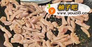 4将炒锅烧热,然后倒油,趁着热锅凉油,将腌制好的肉丝倒入翻炒至变色