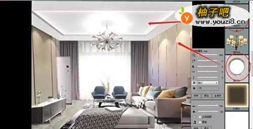4继续对房间中添加家具、灯饰等。每件素材都可做细节调整,只需要点击对应的“材料属性”与“区域属性”,如下图,灯带可以做出发光效果;