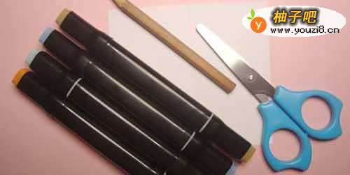 准备好,制作化妆盒图形剪纸手工的材料和工具,有白纸、正方形卡纸、马克笔、铅笔,剪刀,如下图所示。