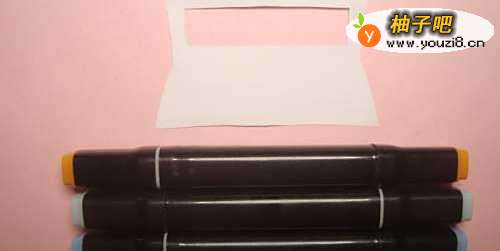 5然后,把化妆盒图形的剪纸展平,摆放在桌子上,并选择红色和浅棕色的马克笔,准备涂上颜色,如下图所示。