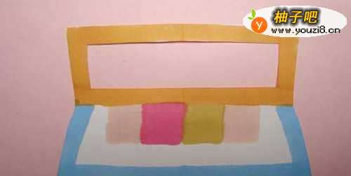 6最后,用浅棕色的马克笔,在剪出的化妆盒的整体图形上,涂颜色,注意颜色要涂均匀,并用浅红色的马克笔给化妆盒的底座图形涂颜色,这样一个好看的化妆盒图形剪纸手工就制作好了,如下图所示。