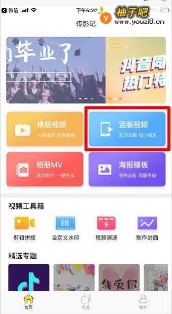 打开传影记,点击“竖屏视频”进入模板。爷案