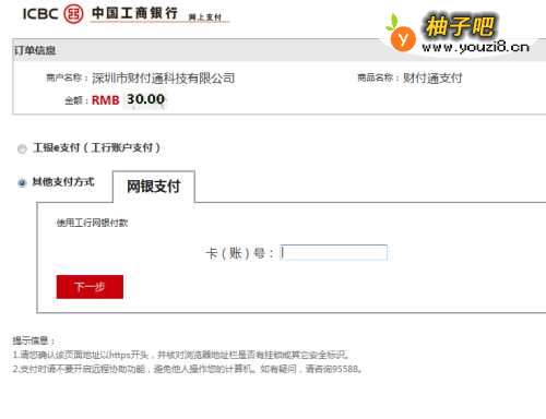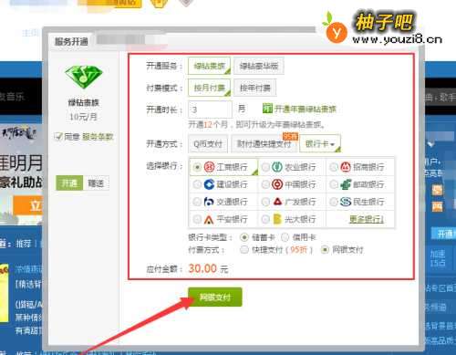 5点击开通绿钻之后,我们就可以打开绿钻服务开通的支付页面了,根据自己的情况去选择好,因为我这里用的是网银付款,所以然后点击“网银支付” 如图