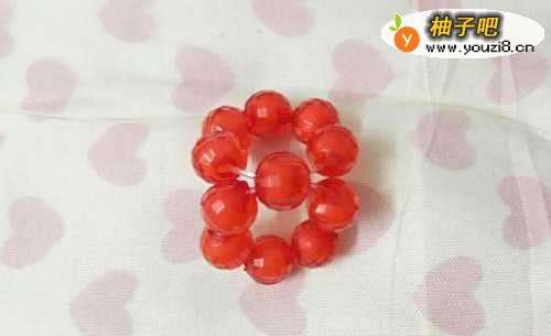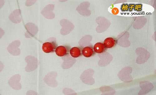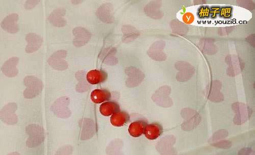 4把尼龙线的两端拉紧,第一圈六个珠子就穿好了。