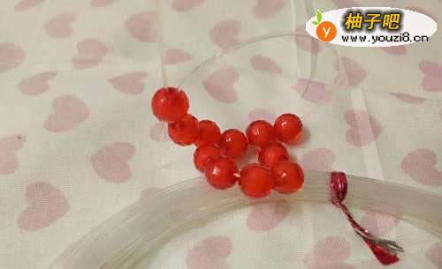 5现在来穿第二圈。先在左手的尼龙线上穿上三个珠子。