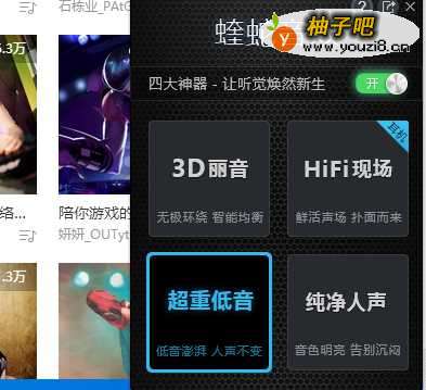 4为了达到更加理想和激情的游戏目地,我们还需要对“音效”进行设置,点击如图所示的“音效”设置按钮,并从弹出的扩展面板中根据自己的爱好进行选择。在此小编选择“超重低音”。