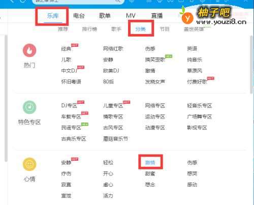 2在“音乐库”界面中,依次切换到“乐库”-“分类”栏目,在“心情”子栏目中找到“激情”按钮点击进入。